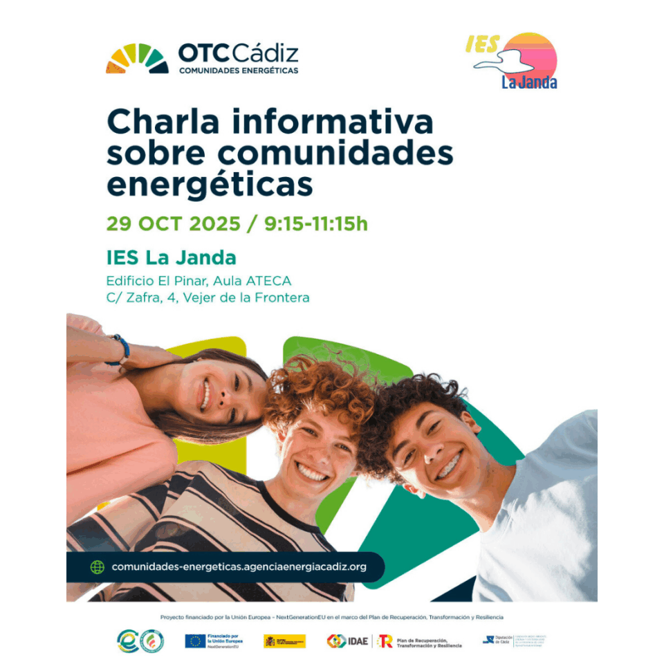 ¿Te has preguntado alguna vez cómo tu comunidad podría generar y compartir su propia energía de manera sostenible? La Oficina de Transición Comunitaria (OTC) de Cádiz, en colaboración con el IES La Janda, tiene la respuesta. Te invitamos a una charla informativa para que descubras todo sobre las Comunidades Energéticas.