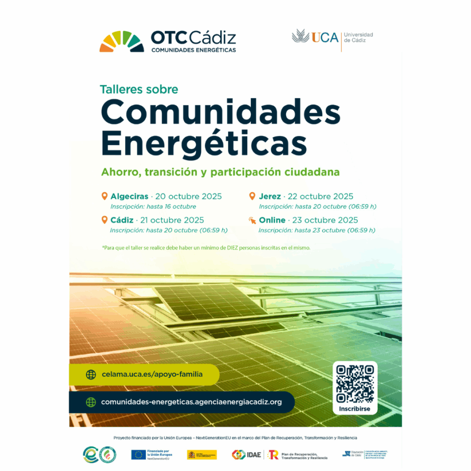 Te gustaría ser parte de un modelo energético más sostenible y justo? Apúntate a estos talleres que vamos a realizar desde el 20 al 23 de octubre en las sedes de la Universidad de Cádiz en Algeciras, Cádiz, Jerez y también ONLINE.